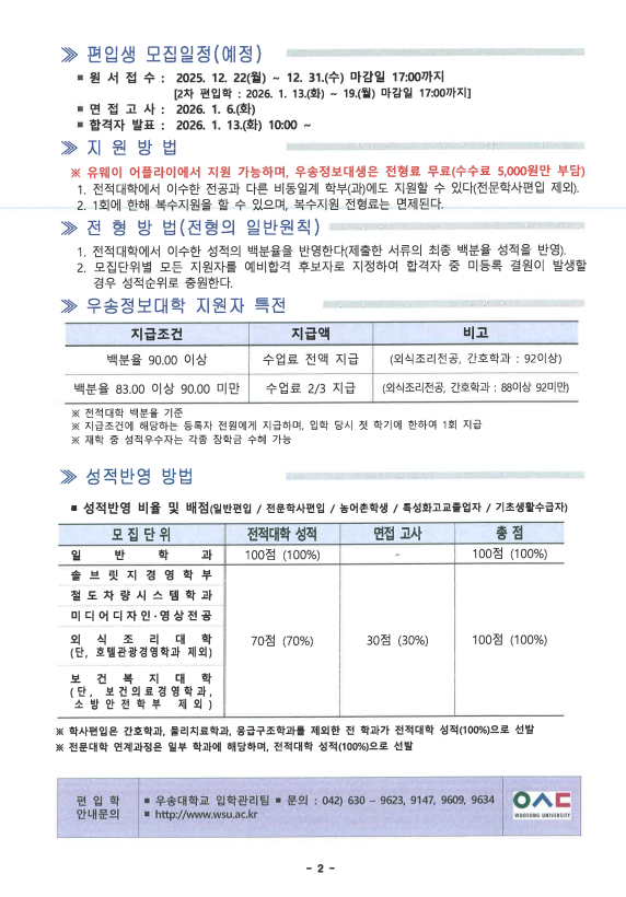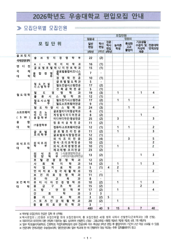 게시판 공지사항 행정관련 Q&A 자유게시판 포토갤러리 취업정보 동영상갤러리 Home게시판공지사항 공지사항 2026학년도 우송대학교 편입모집 안내 카테고리 : | 작성자 : 학과관리자 | 작성일 : 2025.12.02 | 조회수 : 25 첨부파일 2026학년도 우송대학교 편입모집 안내.pdf [35]1.png [19]2.png 목록 이전글 이전 글이 없습니다. 다음글 철도전기안전과 산업인력공단 종목별 과목 인정 사실 안내