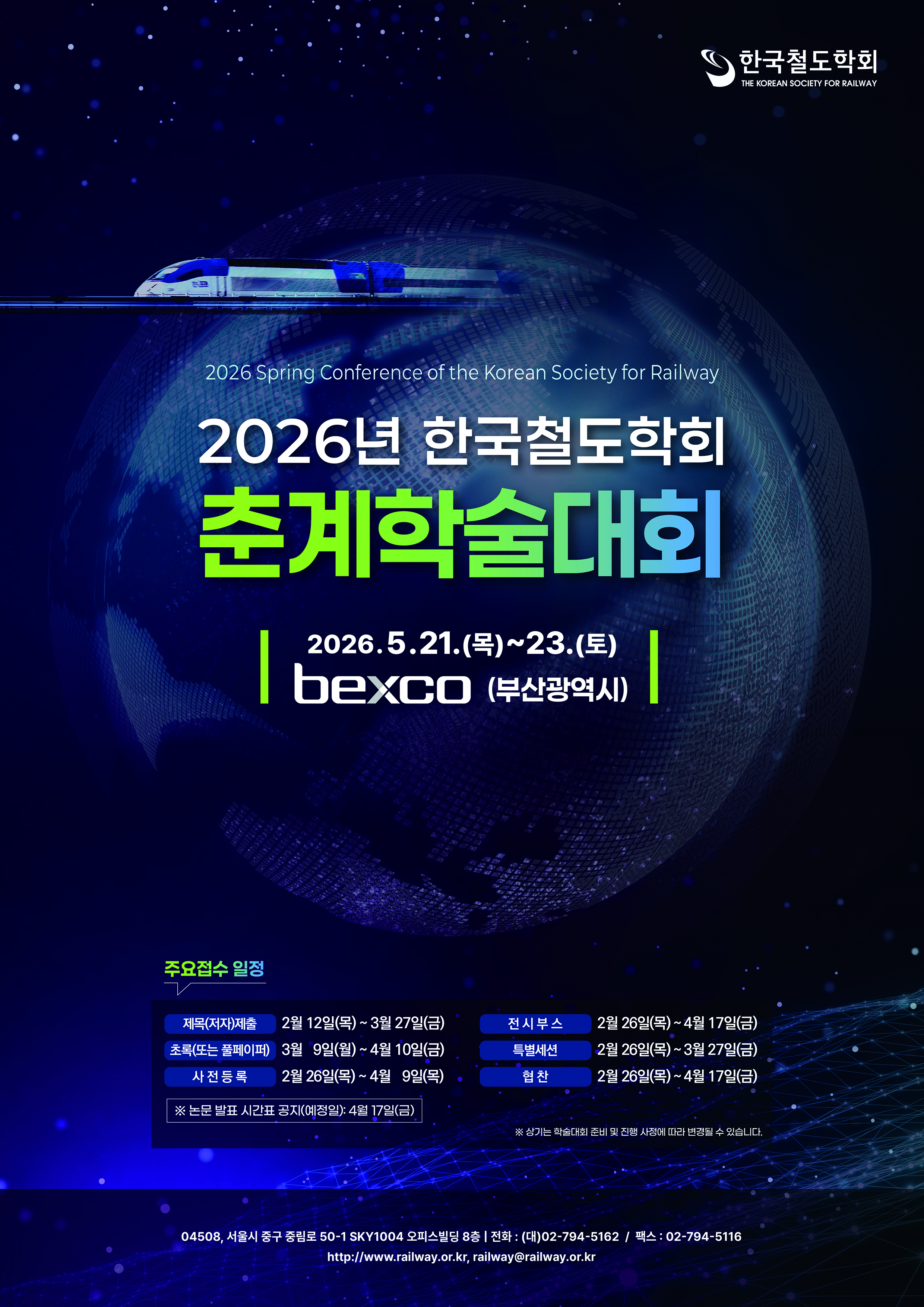 게시판 공지사항 행정관련 Q&A 자유게시판 포토갤러리 취업정보 동영상갤러리 Home게시판공지사항 공지사항 2026년 한국철도학회 춘계학술대회 안내 카테고리 : | 작성자 : 학과관리자 | 작성일 : 2026.03.03 | 조회수 : 46 첨부파일 KakaoTalk_20260303_171632477.jpg 목록 이전글 우송대학교 철도전기시스템전공 연계교육과정 운영 협약 안내 다음글 2026 학생 철도 창의 작품전 안내